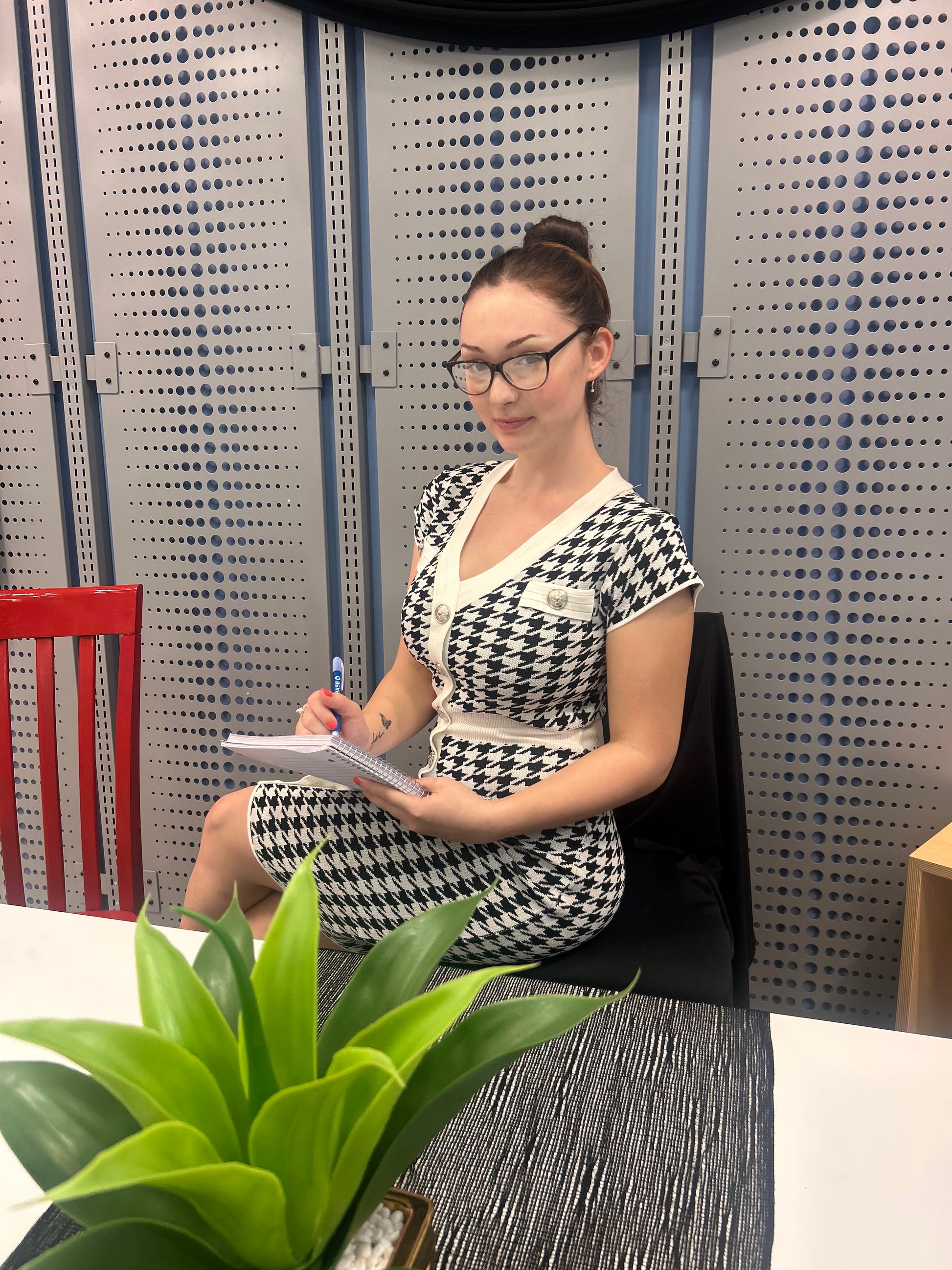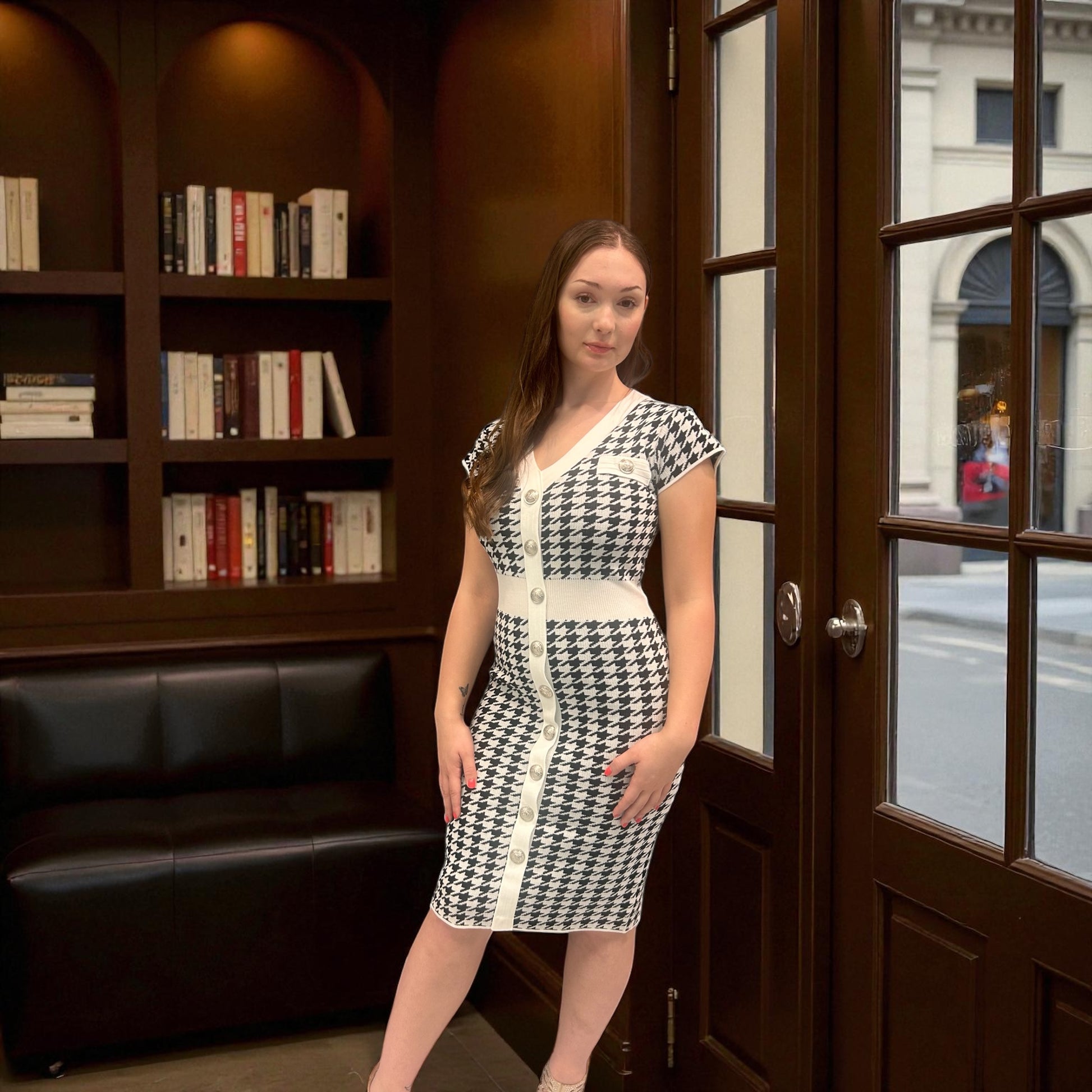 Houndstooth is never out of style. this cute knit dress is comfortable and classy.