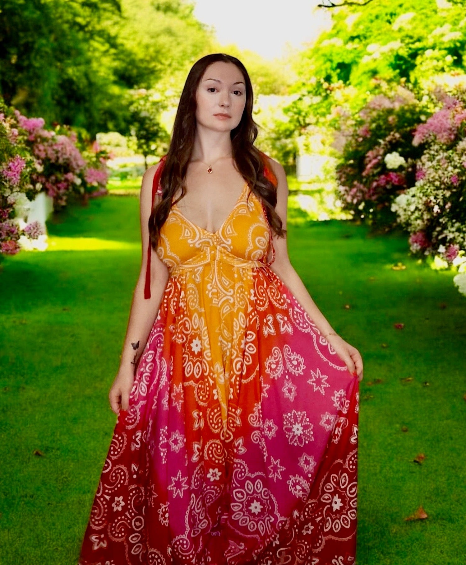 Radiate warmth and confidence in the Sunset Bloom Maxi Dress. This flowing bohemian beauty blends shades of golden amber, fiery red, and rose pink in a stunning ombré bandana print that feels like wearing a summer sunset. The deep V-neckline and adjustable straps add a touch of effortless femininity, while the lightweight fabric drapes gracefully for a free-spirited, garden-ready look.